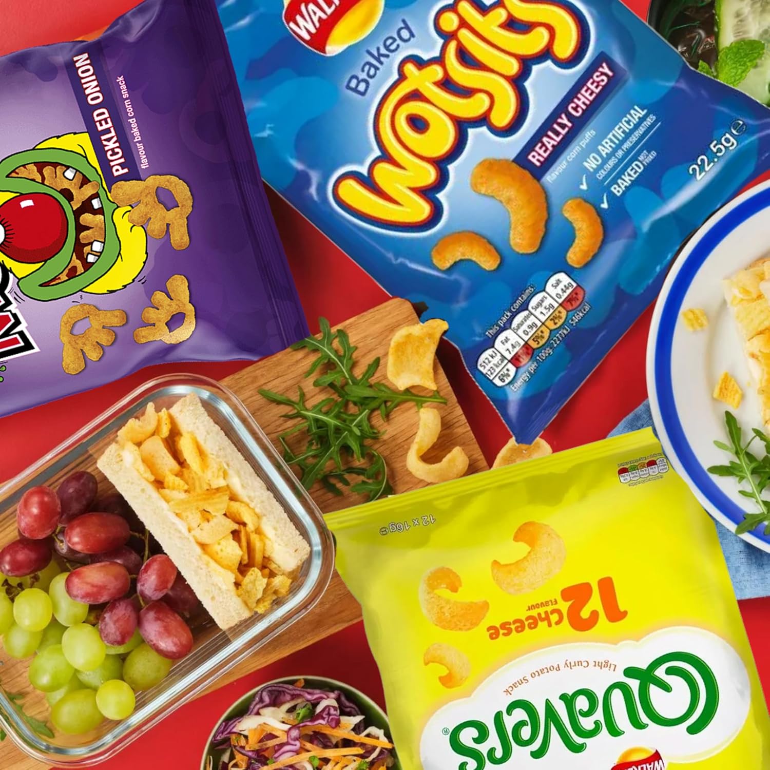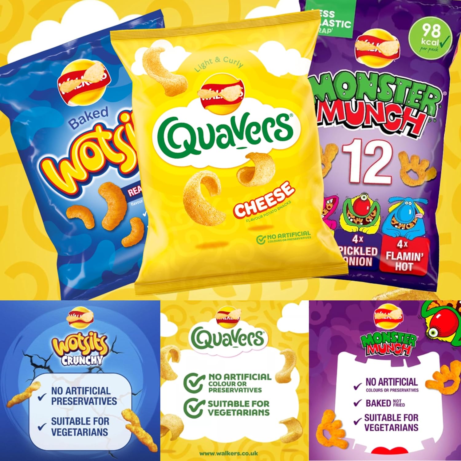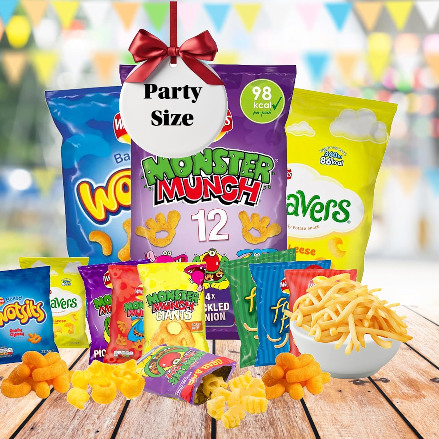 - This crisps multipack features three iconic snacks: Quavers cheese, Baked Wotsits and Mega Monster Munch Crisps Snack Mix. With 24 x 16g packs of Quavers cheese, 24 x 26.5g packs of Baked Wotsits and 12 x 20g packs of Mega Monster Munch Crisps Snacks Mix ( 4 x Roast Beef, 4 x Pickled Onion, 4 x Flamin Hot ), this variety box ensures you’ll have an abundance of delicious snacks to enjoy. Also you will get EXTRA 3 x 18g assorted French Fries crisps bags; Salted, Cheese & Onion and Salt & Vinegar.