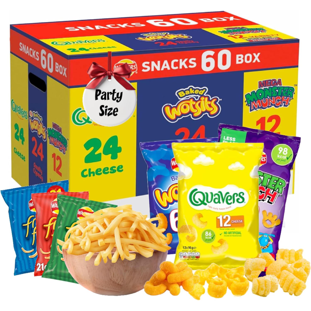 3 iconic snacks: 24 x 16g packs of Quavers cheese, 24 x 26.5g packs of Baked Wotsits and 12 x 20g packs of Mega Monster Munch Crisps ( 4 x Roast Beef, 4 x Pickled Onion, 4 x Flami Hot ). Also you will get EXTRA 3 x 18g assorted French Fries crisps bags; Salted, Cheese & Onion and Salt & Vinegar.