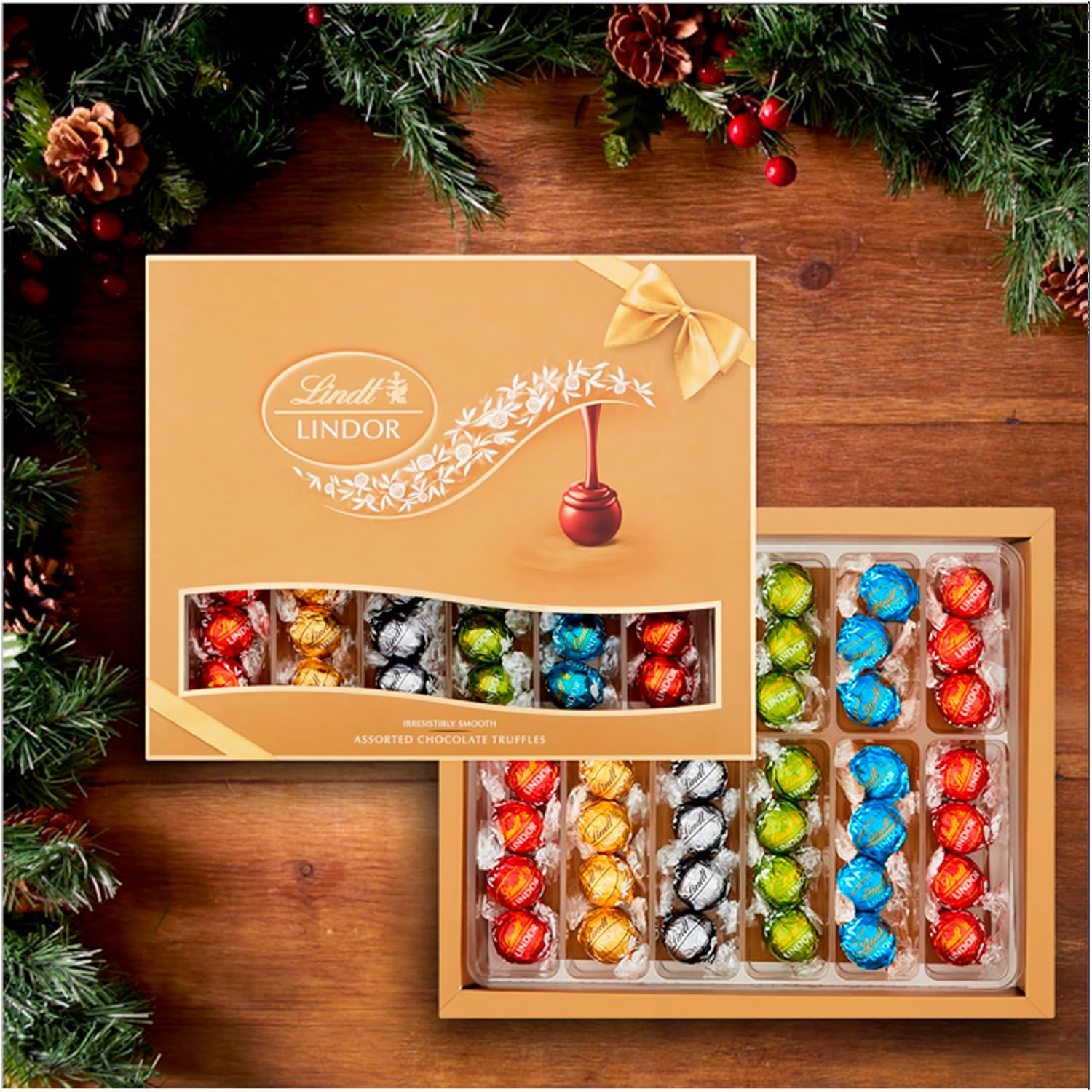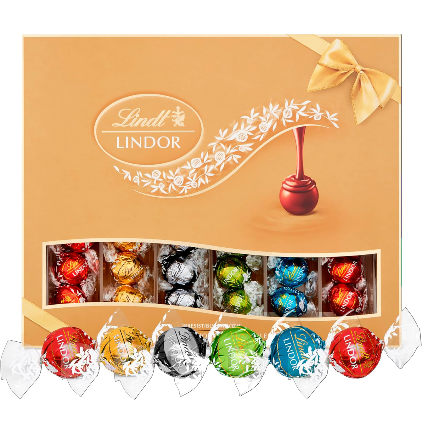 Lindt LINDOR Chocolate Truffles – smooth melting chocolate balls with an irresistibly smooth filling, approx. 42 balls, 525g gift box Lindor milk chocolate truffles with a smooth melting fillingLindor white chocolate truffles with a smooth melting fillingLindor extra dark chocolate truffles with a smooth melting fillingLindor milk chocolate truffles with a smooth melting pistachio fillingLindor milk chocolate truffles with salt crystals (Fleur de Sel) and a smooth melting caramel filling.